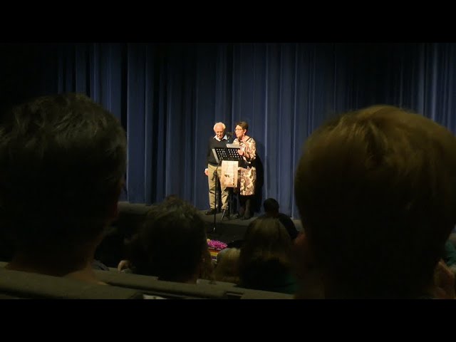 La presentación constó de tres partes. En la primera salieron al escenario Carmen Carreras, la secretaria de la Asociación, y Manuel Yuste, socio, hijo de maestros que formaron parte de las Milicias de la Cultura en la 12ª División.
