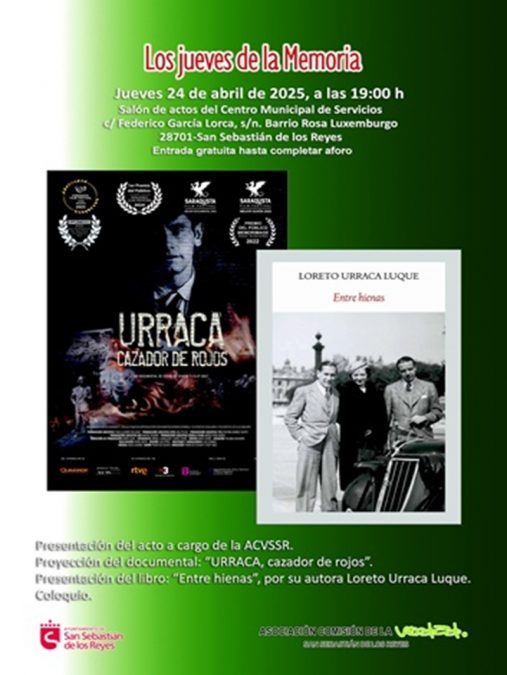 El jueves 24 de abril tuvo lugar en el salón de actos del Centro Municipal de Servicios de San Sebastián de los Reyes otro jueves de la Memoria. En esta ocasión el documental “Urraca, cazador de rojos” dedicado a la figura de Pedro Urraca Rendueles, policía franquista, agente E-8001 de la Gestapo y colaborador del Régimen de Vichy.